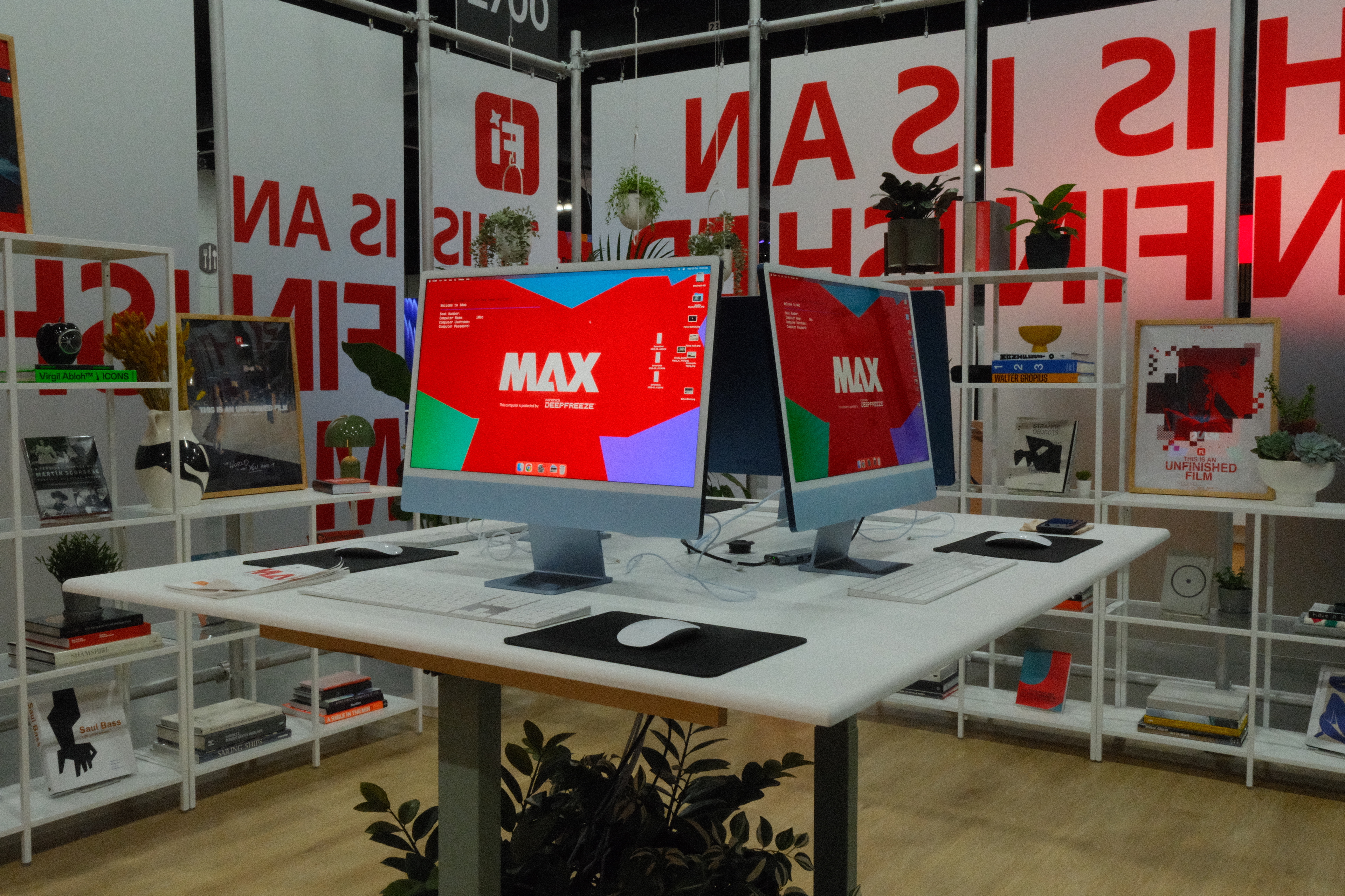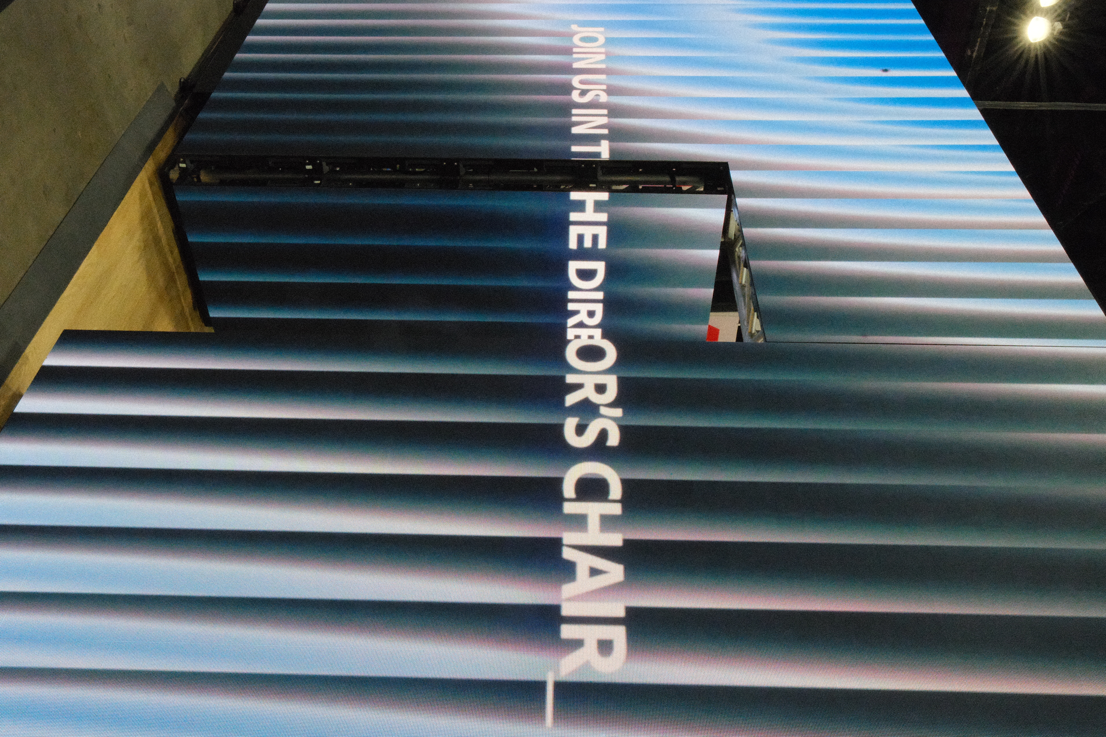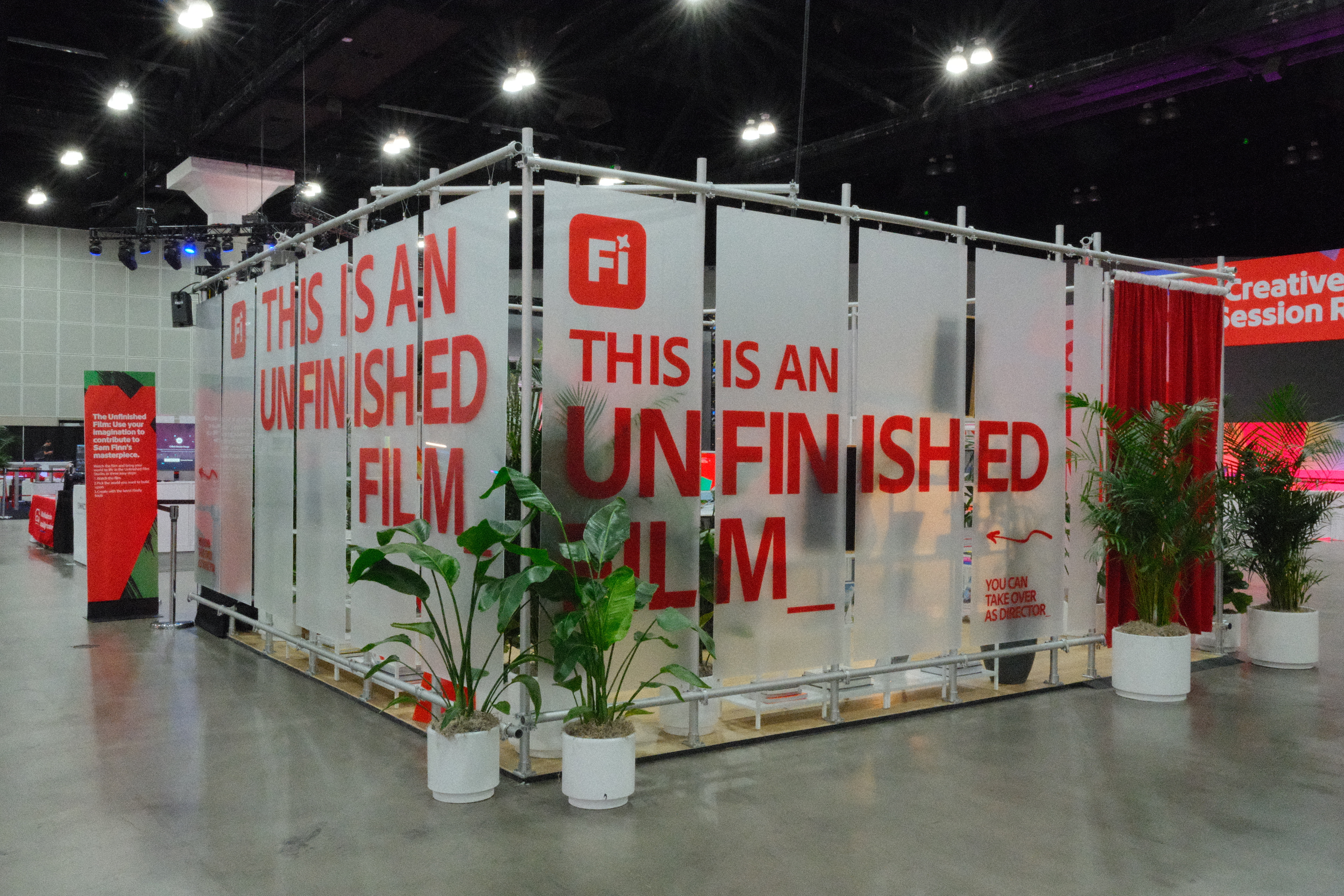 A solution emerged that allowed both maximum screening real estate and maximum workstation zones and a clever reveal for attendees: an enclosed cube with a 20ft LED wall featuring a hidden door that opened up to our “FireFly Studio” post-screening. The film, “UNFINISHED FILM” is presented as a work-in-progress short, giving guests an ability to add shots via FireFly to help complete it. Once the viewing concluded, the Adobe brand team would open the door (a la OZ) to reveal the studio hidden inside the cube.